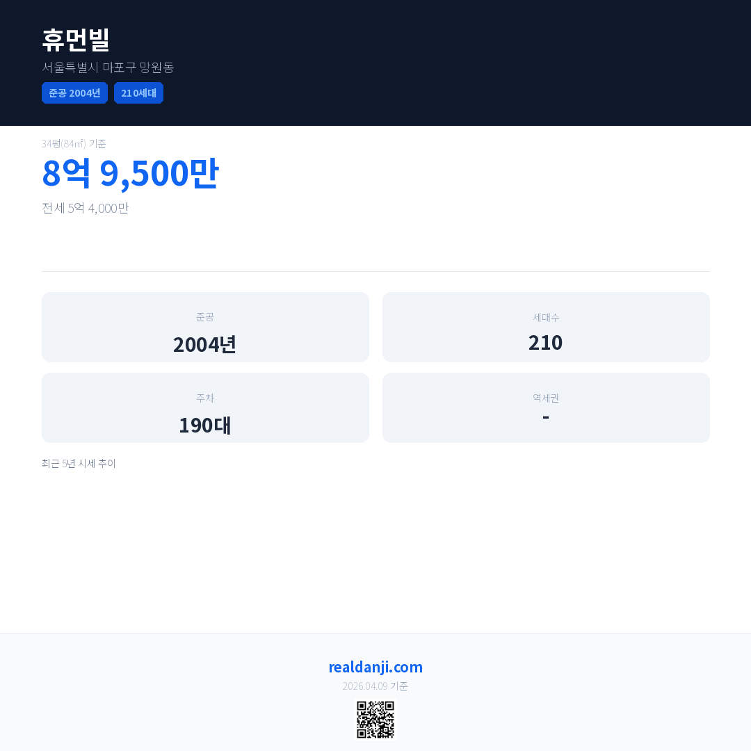 휴먼빌은(는) 2004년에 준공되었으며, 현재 22년차입니다. 총 210세대 규모입니다.
