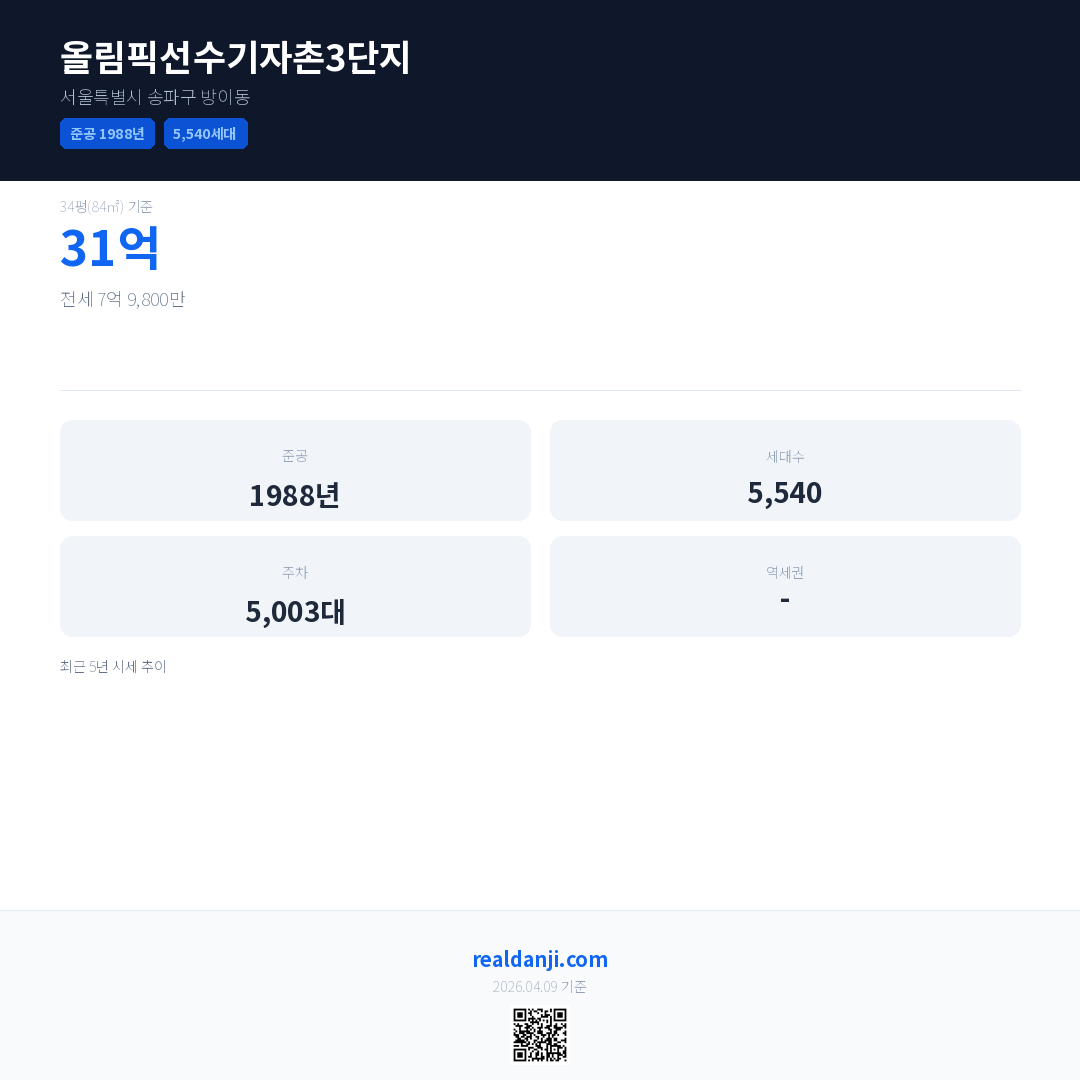 올림픽선수기자촌3단지 최근 거래가는 31억입니다. (2026-04)