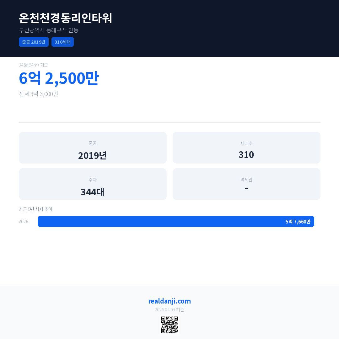 온천천경동리인타워 최근 거래가는 6억 2,500만입니다. (2026-04)