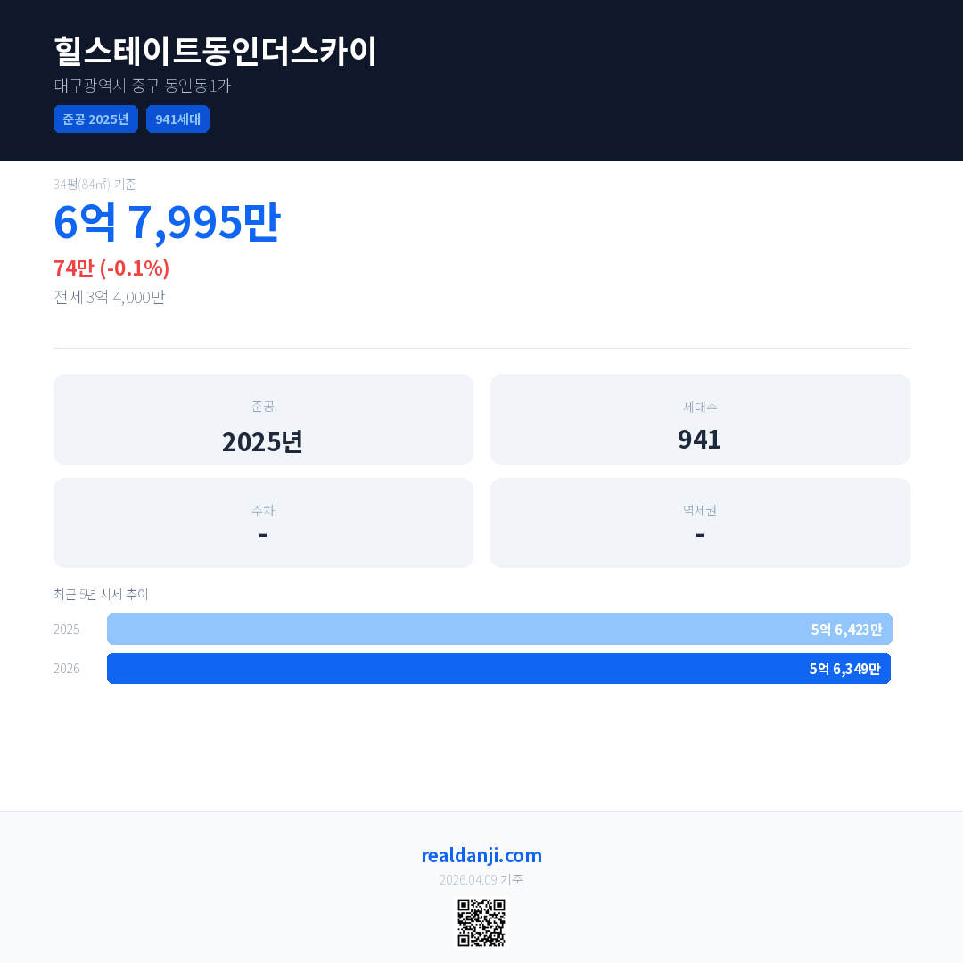 힐스테이트동인더스카이 국민평형 기준 2026년 평균 거래가는 5억 6,349만으로, 전년 대비 0.1% 하락 했습니다.