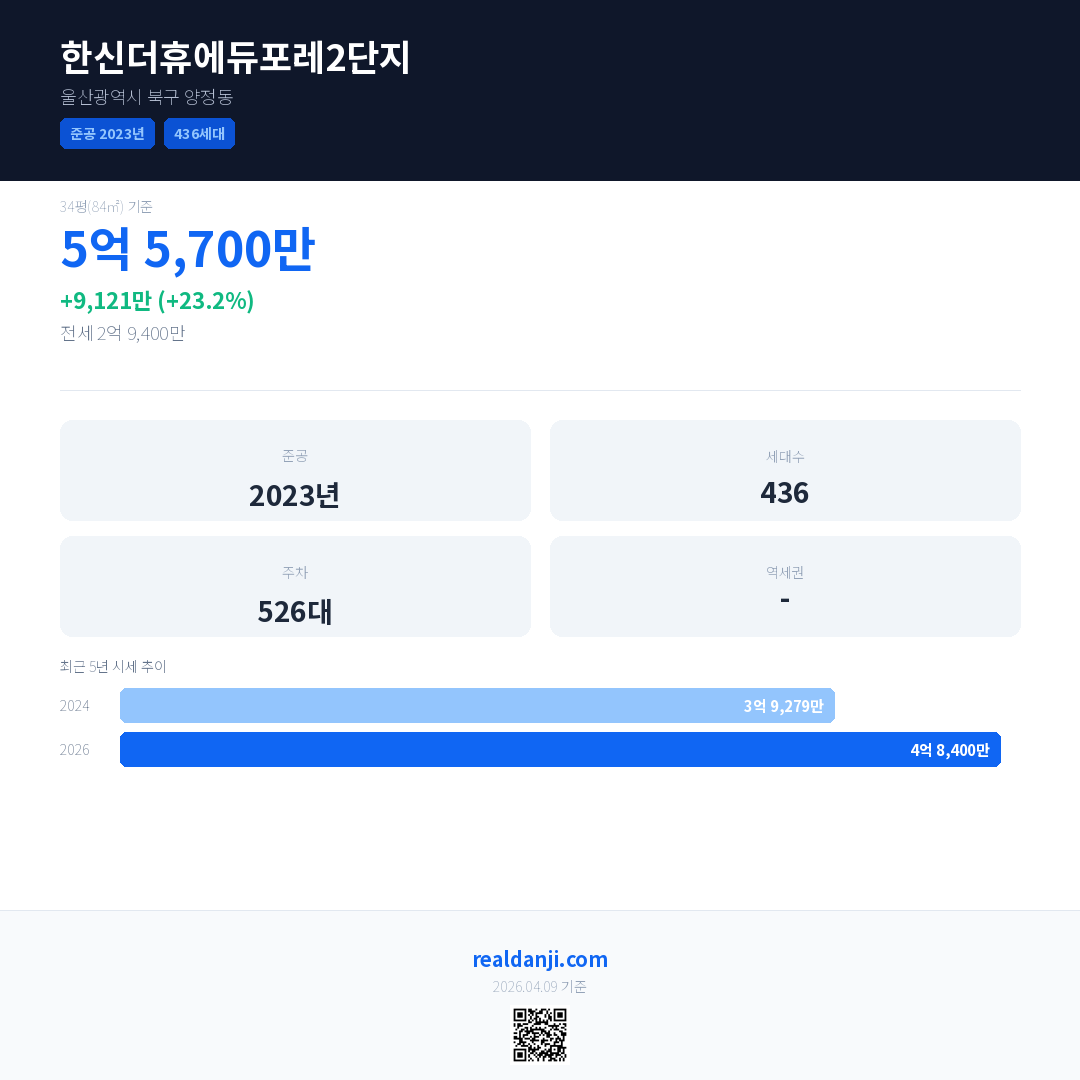 한신더휴에듀포레2단지 국민평형 기준 2026년 평균 거래가는 4억 8,400만으로, 전년 대비 23.2% 상승 했습니다.