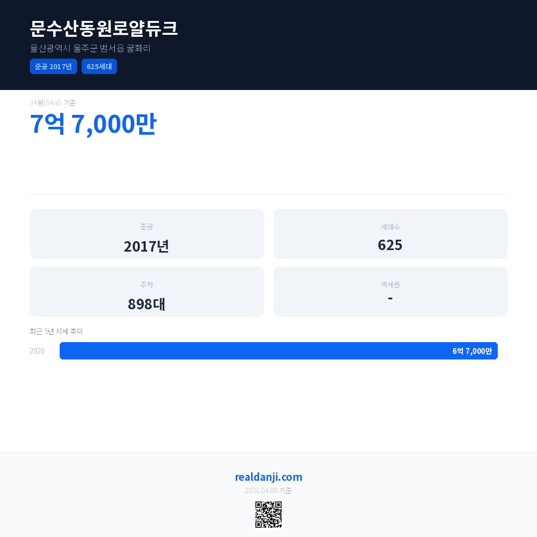 문수산동원로얄듀크은(는) 2017년에 준공되었으며, 현재 9년차입니다. 총 625세대 규모입니다.