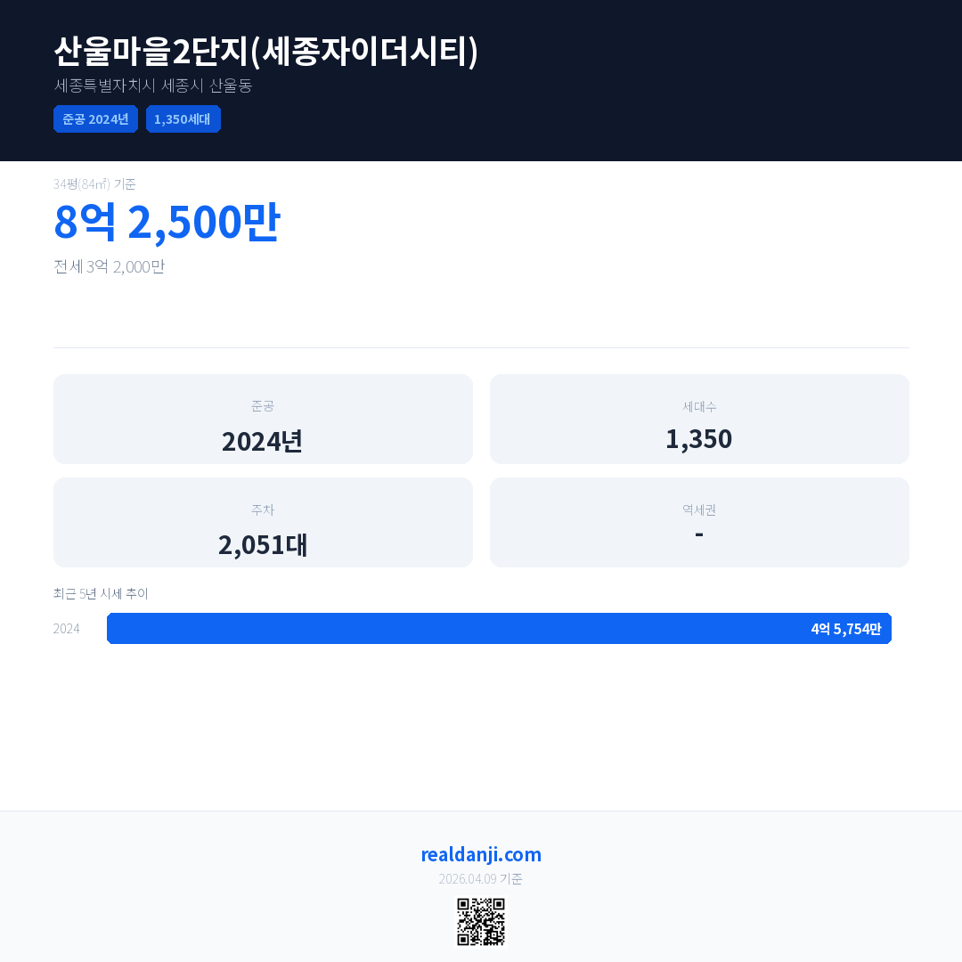 산울마을2단지(세종자이더시티)은(는) 2024년에 준공되었으며, 현재 2년차입니다. 총 1,350세대 규모입니다.