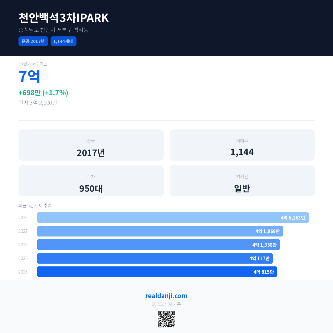 천안백석3차IPARK 국민평형 기준 2026년 평균 거래가는 4억 815만으로, 전년 대비 1.7% 상승 했습니다.