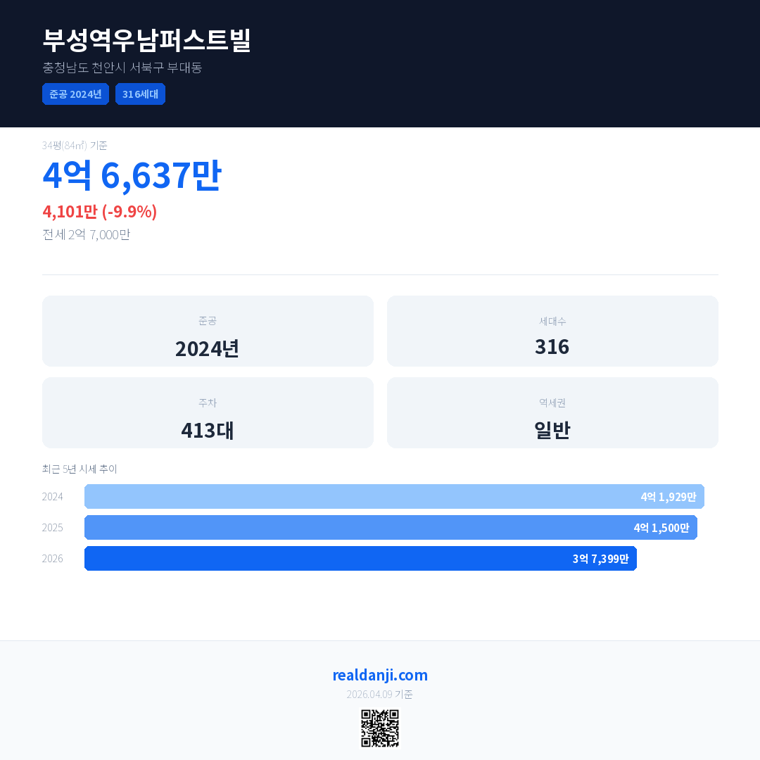부성역우남퍼스트빌은(는) 2024년에 준공되었으며, 현재 2년차입니다. 총 316세대 규모입니다.