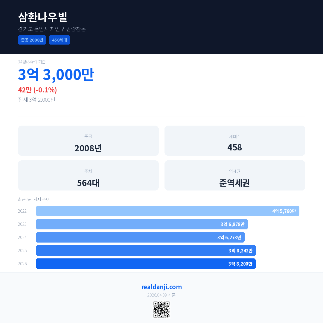 삼환나우빌 국민평형 기준 2026년 평균 거래가는 3억 8,200만으로, 전년 대비 0.1% 하락 했습니다.