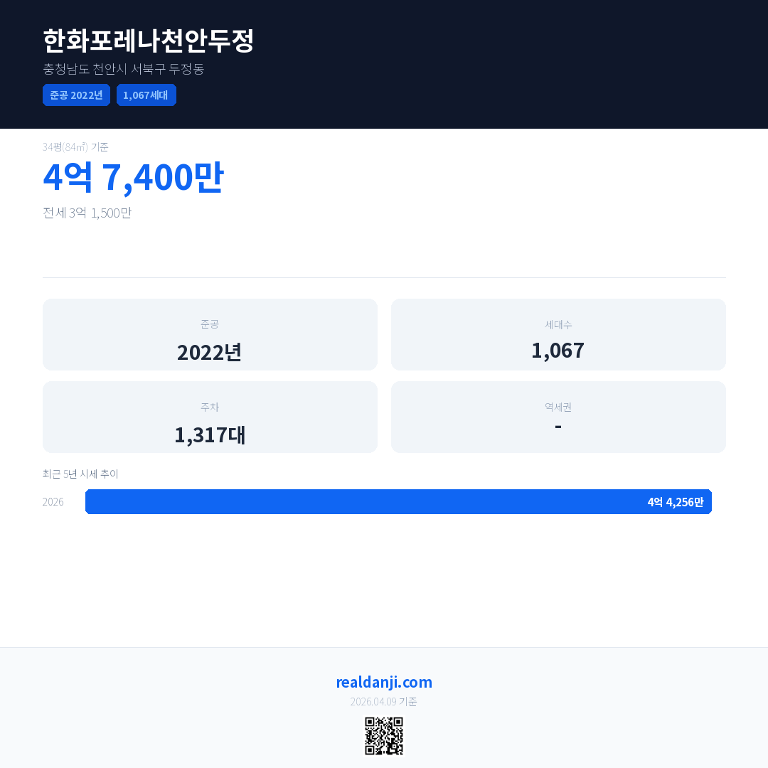 한화포레나천안두정 최근 거래가는 4억 4,900만입니다. (2026-04)