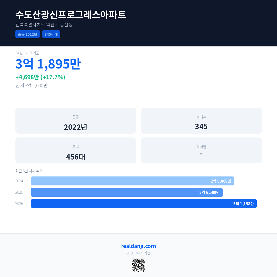 수도산광신프로그레스아파트 국민평형 기준 2026년 평균 거래가는 3억 1,198만으로, 전년 대비 17.7% 상승 했습니다.