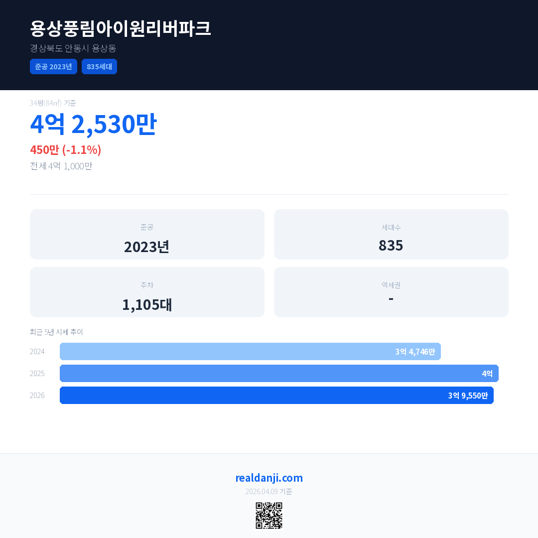 용상풍림아이원리버파크 최근 거래가는 3억 8,400만입니다. (2026-03)