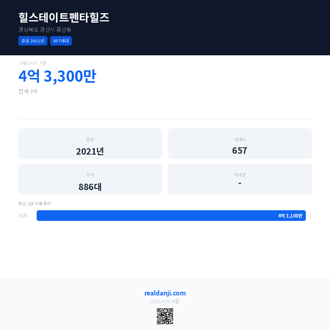 힐스테이트펜타힐즈 최근 거래가는 4억 3,300만입니다. (2026-03)