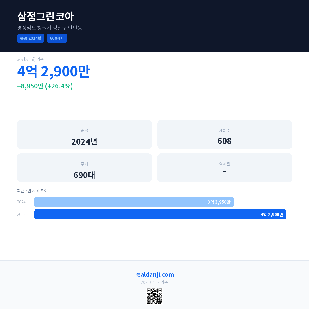 삼정그린코아 국민평형 기준 2026년 평균 거래가는 4억 2,900만으로, 전년 대비 26.4% 상승 했습니다.