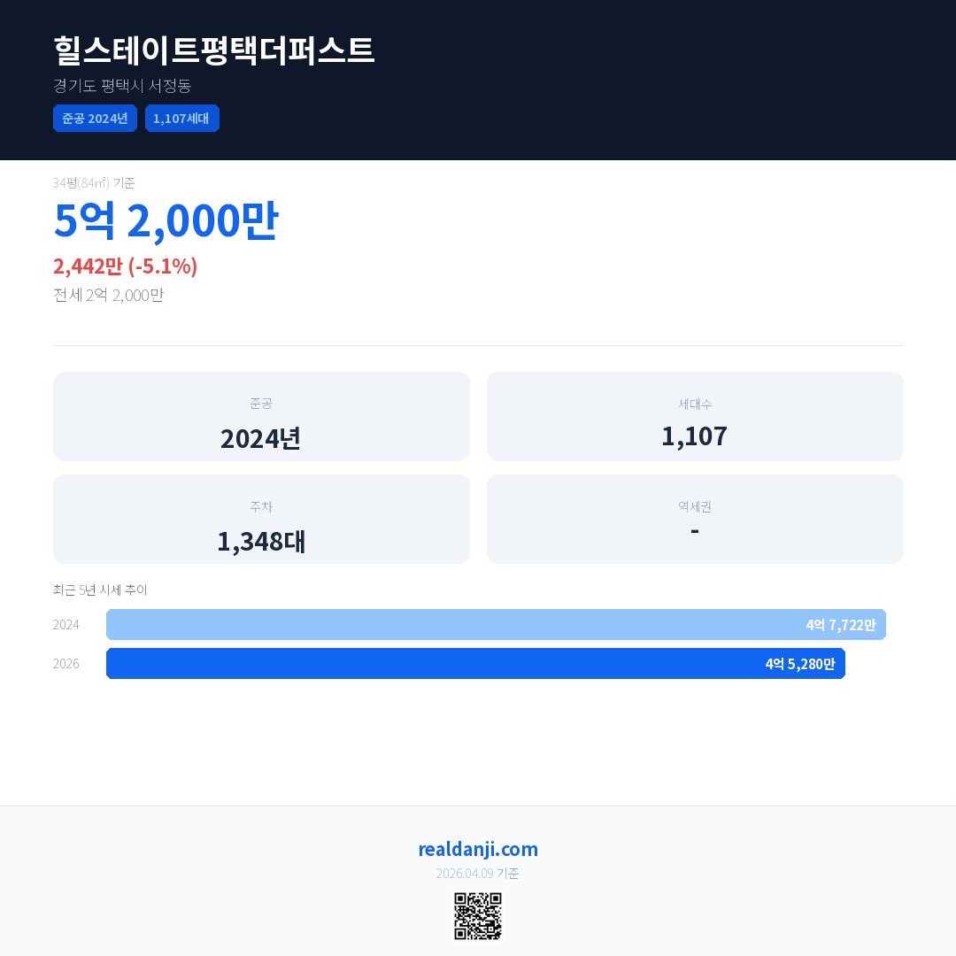 힐스테이트평택더퍼스트 최근 거래가는 5억 2,000만입니다. (2026-04)