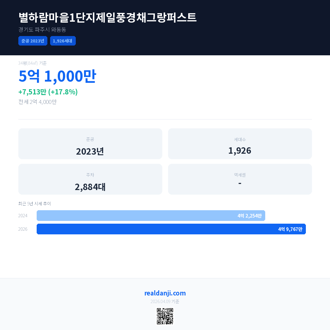 별하람마을1단지제일풍경채그랑퍼스트 국민평형 기준 2026년 평균 거래가는 4억 9,767만으로, 전년 대비 17.8% 상승 했습니다.