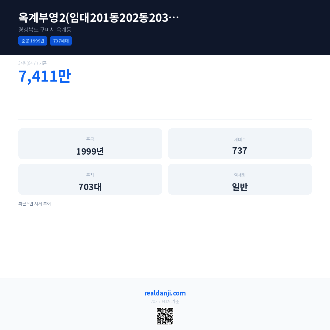 옥계부영2(임대201동202동203동204동)은(는) 1999년에 준공되었으며, 현재 27년차입니다. 총 737세대 규모입니다.