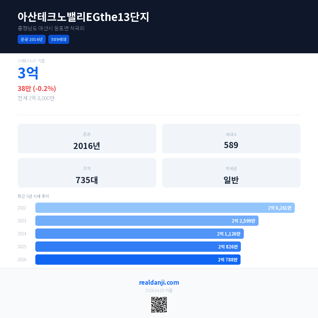 아산테크노밸리EGthe13단지 최근 거래가는 3억입니다. (2026-03)
