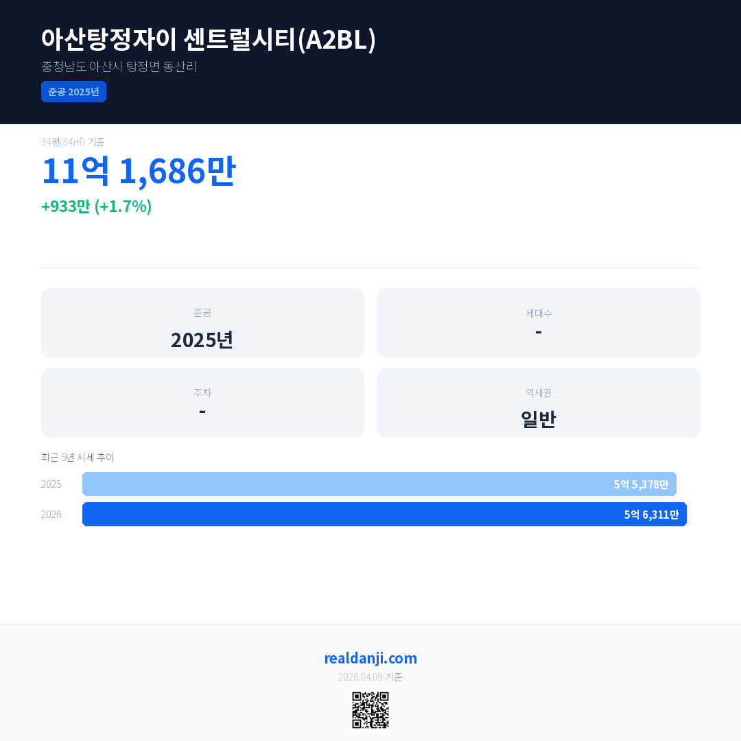 아산탕정자이 센트럴시티(A2BL) 국민평형 기준 2026년 평균 거래가는 5억 6,311만으로, 전년 대비 1.7% 상승 했습니다.