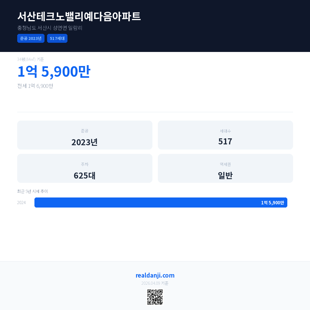 서산테크노밸리예다음아파트 최근 거래가는 1억 5,900만입니다. (2024-02)