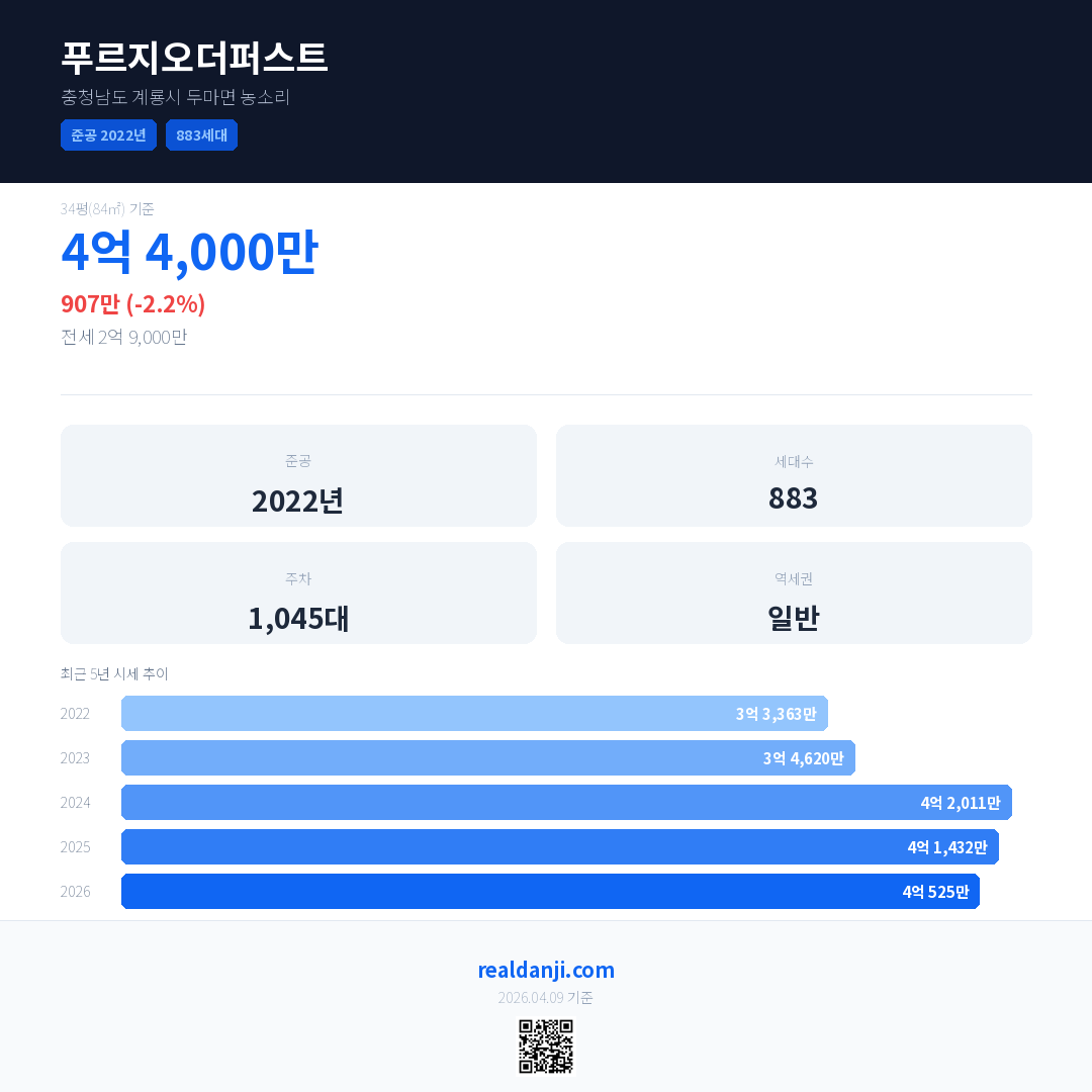 푸르지오더퍼스트은(는) 2022년에 준공되었으며, 현재 4년차입니다. 총 883세대 규모입니다.