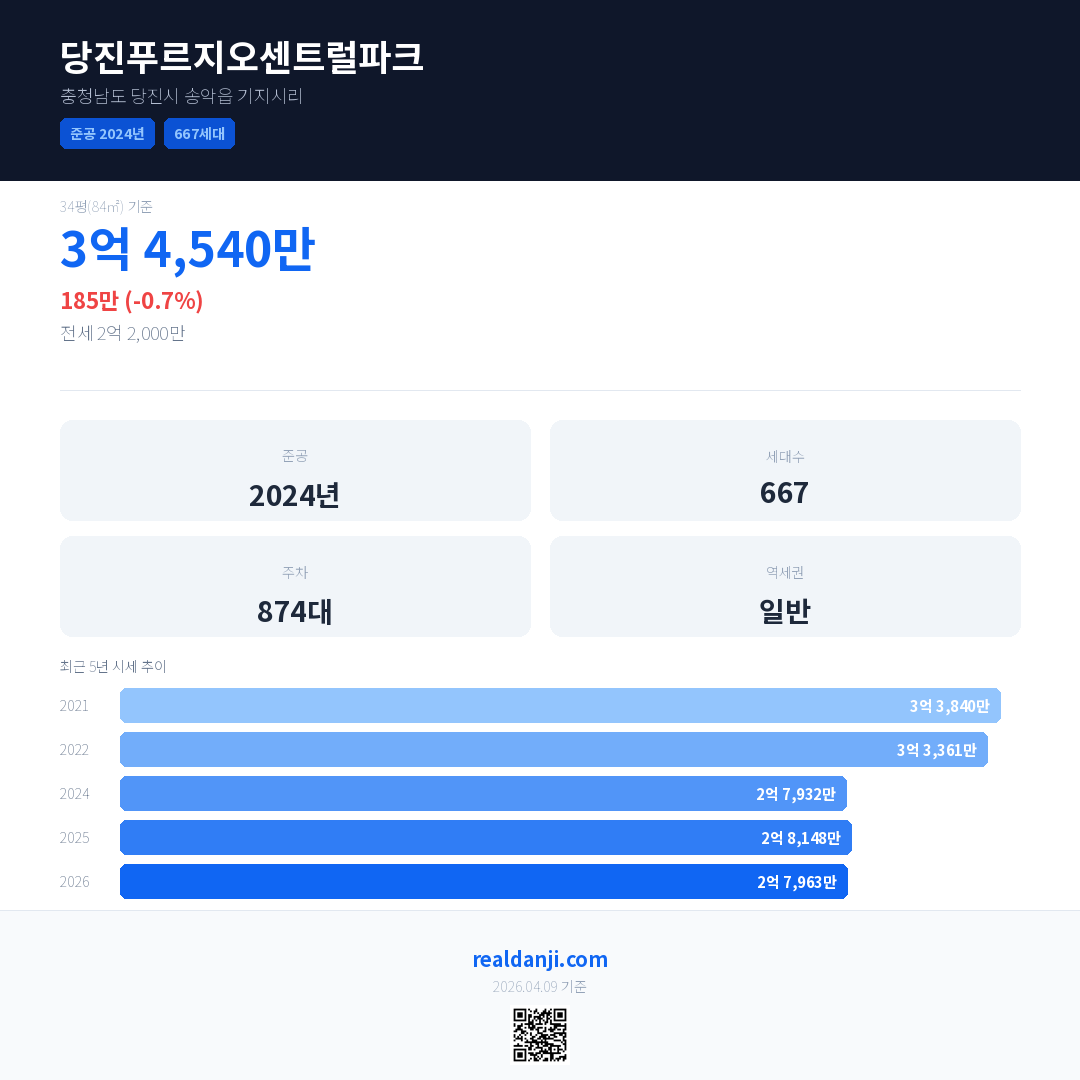 당진푸르지오센트럴파크 최근 거래가는 3억 800만입니다. (2026-04)