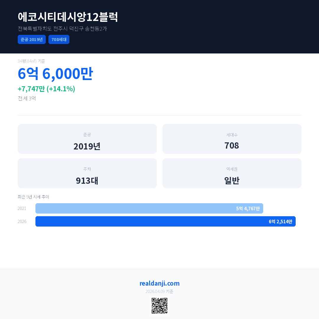 에코시티데시앙12블럭 국민평형 기준 2026년 평균 거래가는 6억 2,514만으로, 전년 대비 14.1% 상승 했습니다.