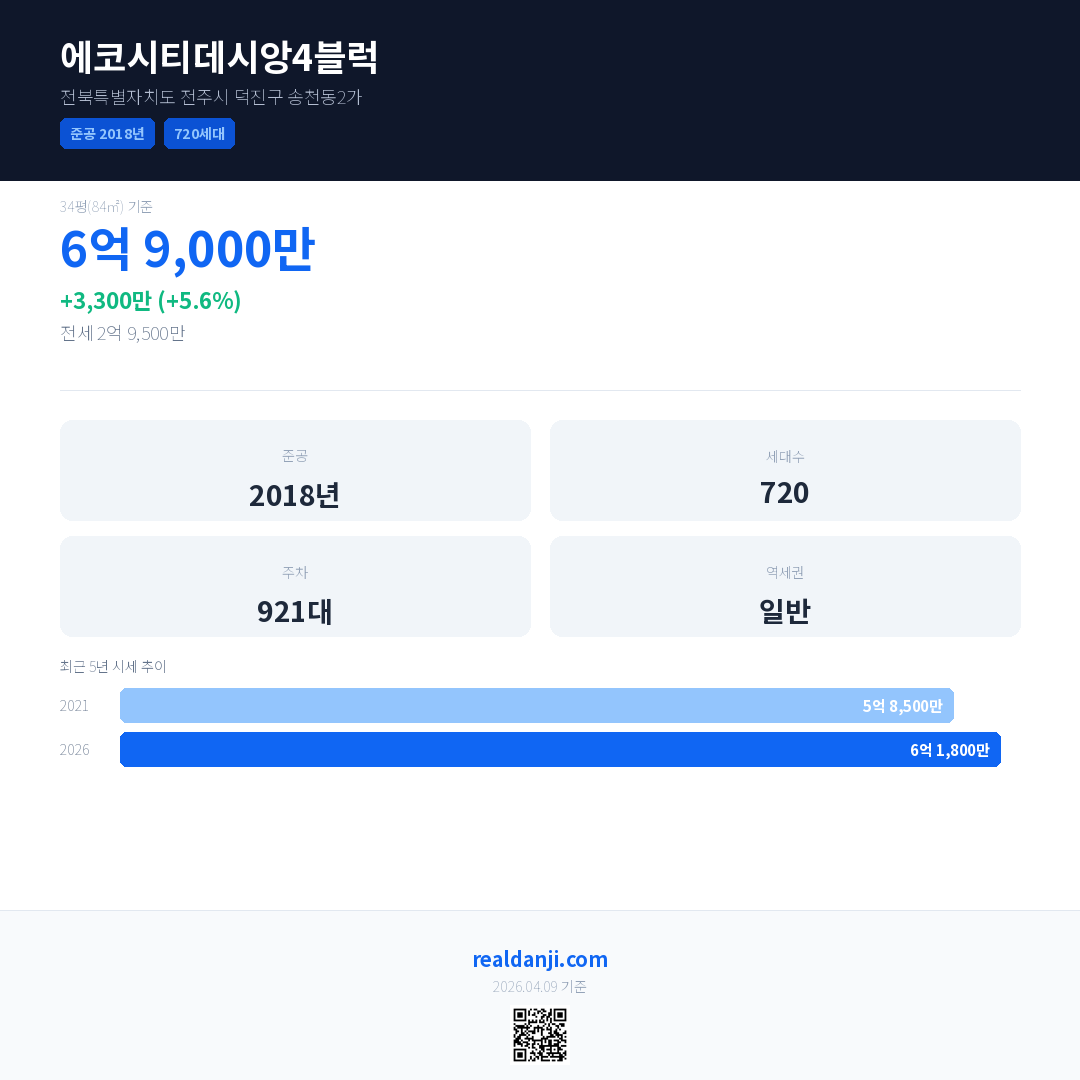 에코시티데시앙4블럭 국민평형 기준 2026년 평균 거래가는 6억 1,800만으로, 전년 대비 5.6% 상승 했습니다.