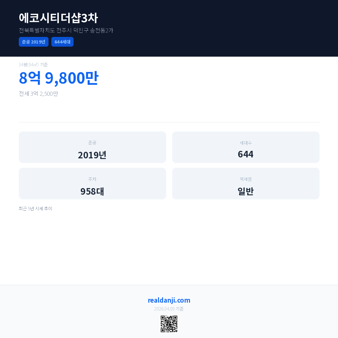 에코시티더샵3차은(는) 2019년에 준공되었으며, 현재 7년차입니다. 총 644세대 규모입니다.