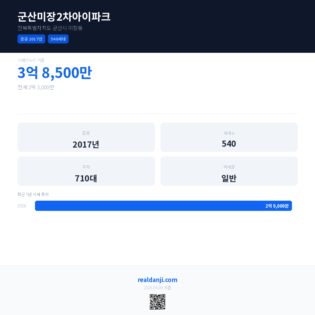 군산미장2차아이파크 최근 거래가는 2억 8,200만입니다. (2026-04)