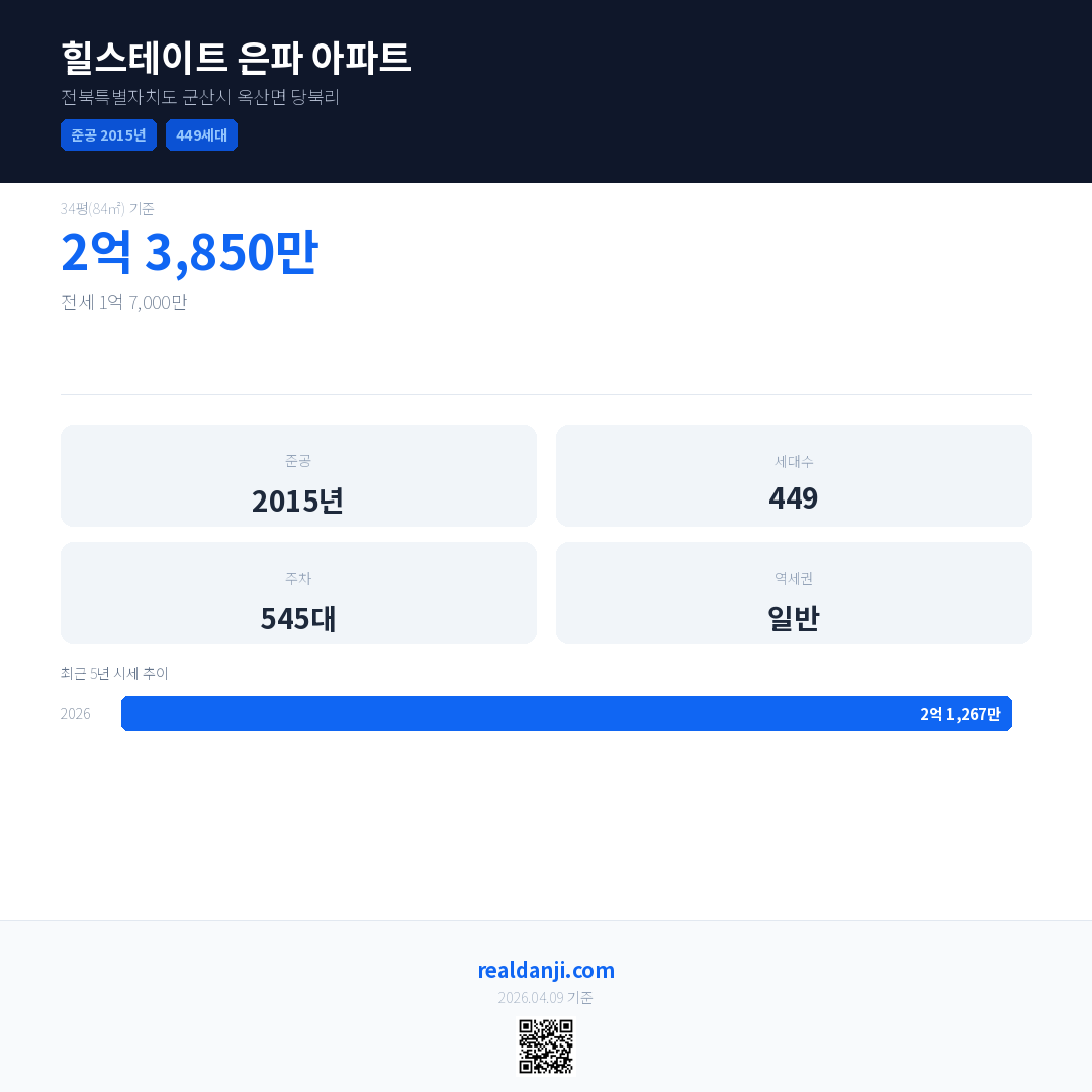 힐스테이트 은파 아파트 국민평형 기준 2026년 평균 거래가는 2억 1,267만으로, 전년 대비 6.3% 상승 했습니다.