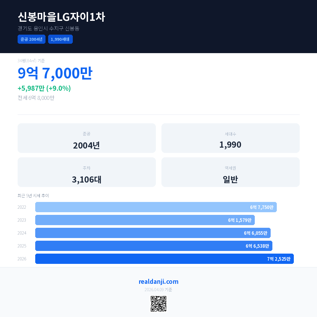 신봉마을LG자이1차 최근 거래가는 9억 7,000만입니다. (2026-04)