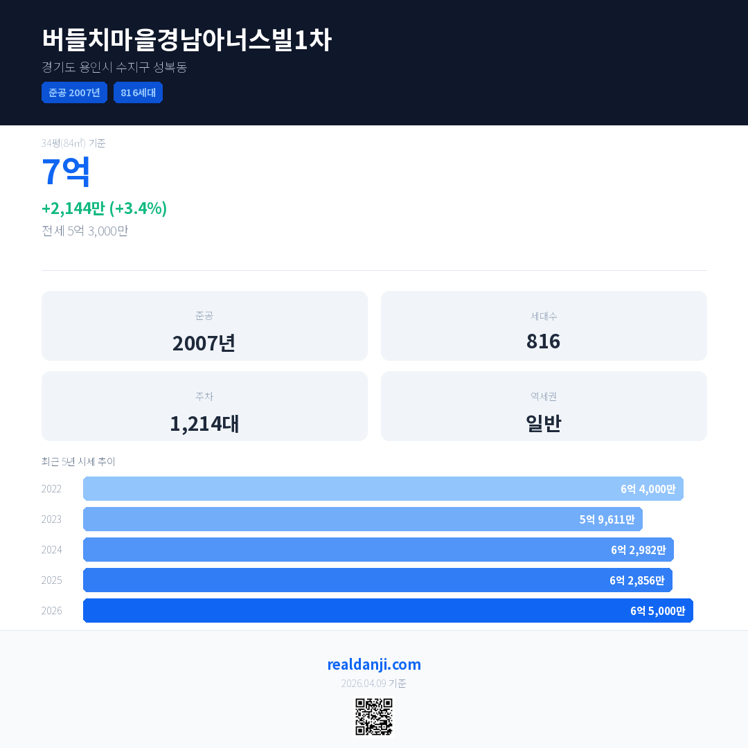 버들치마을경남아너스빌1차 국민평형 기준 2026년 평균 거래가는 6억 5,000만으로, 전년 대비 3.4% 상승 했습니다.