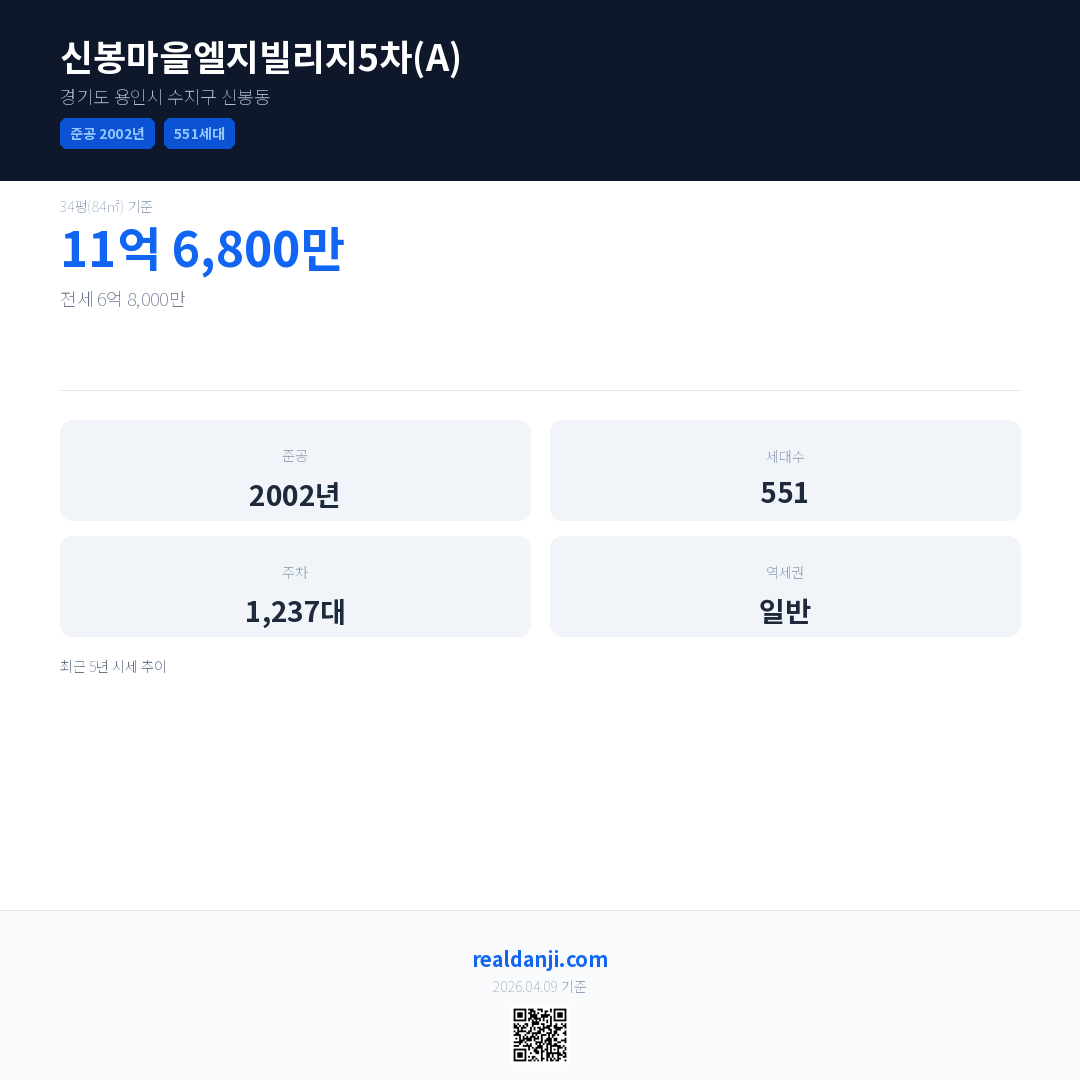 신봉마을엘지빌리지5차(A) 최근 거래가는 11억 6,800만입니다. (2026-03)