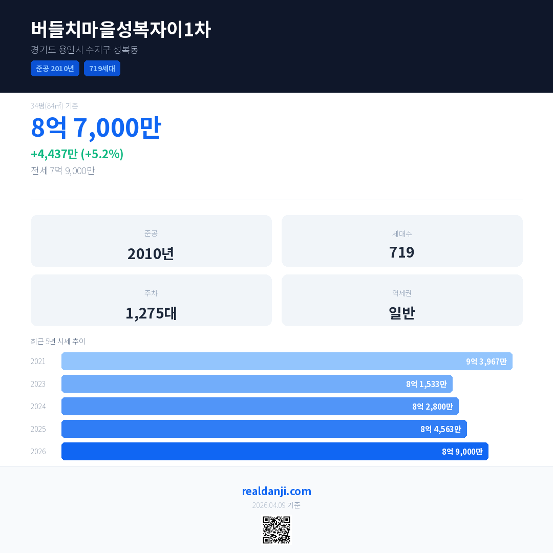 버들치마을성복자이1차 국민평형 기준 2026년 평균 거래가는 8억 9,000만으로, 전년 대비 5.2% 상승 했습니다.