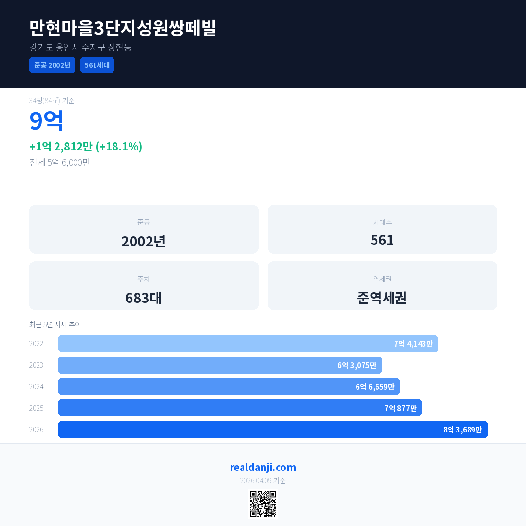 만현마을3단지성원쌍떼빌 최근 거래가는 9억입니다. (2026-03)