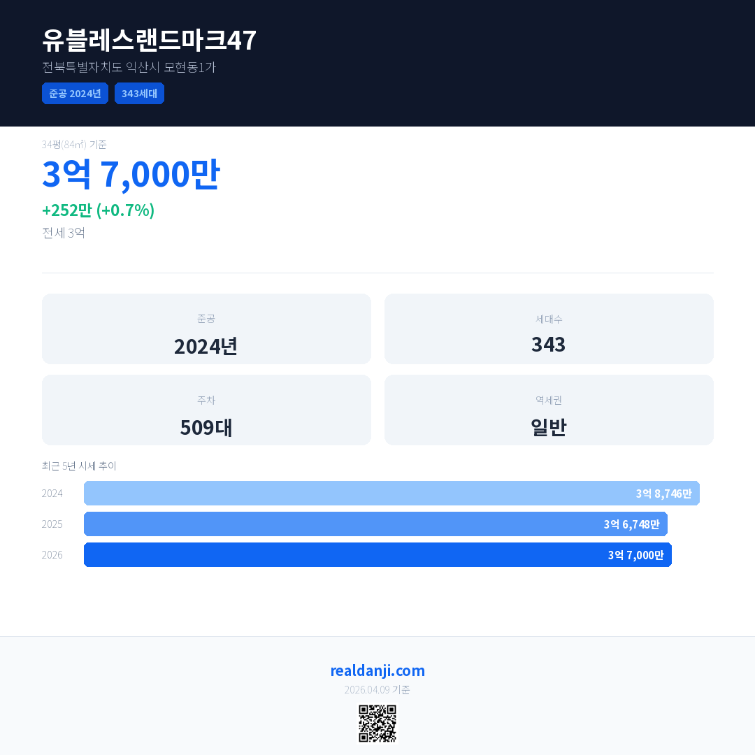 유블레스랜드마크47 국민평형 기준 2026년 평균 거래가는 3억 7,000만으로, 전년 대비 0.7% 상승 했습니다.