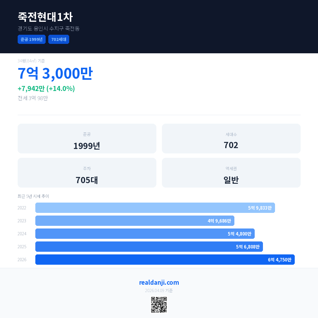 죽전현대1차 국민평형 기준 2026년 평균 거래가는 6억 4,750만으로, 전년 대비 14.0% 상승 했습니다.