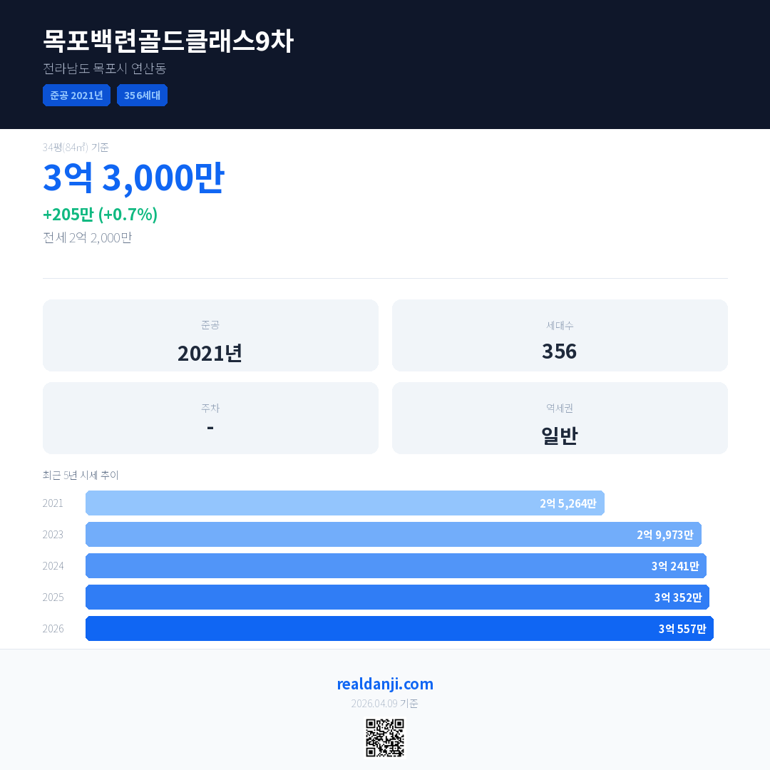 목포백련골드클래스9차 국민평형 기준 2026년 평균 거래가는 3억 557만으로, 전년 대비 0.7% 상승 했습니다.