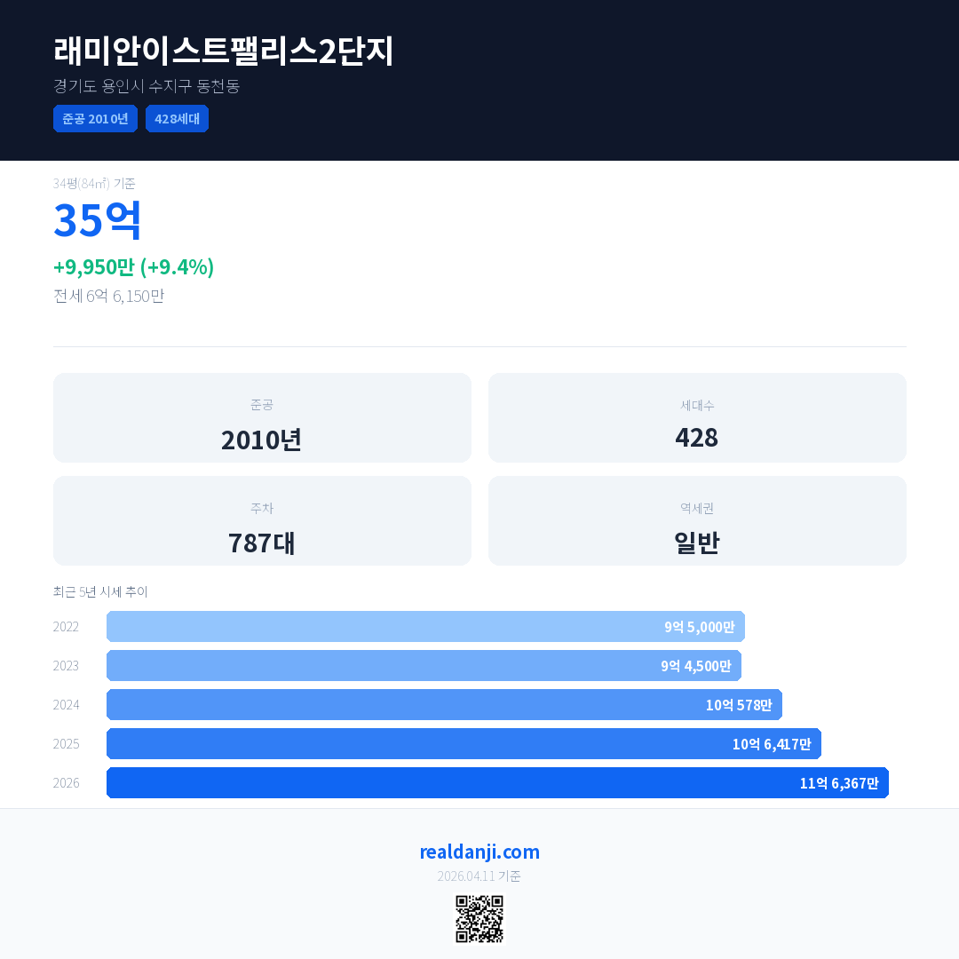 래미안이스트팰리스2단지은(는) 2010년에 준공되었으며, 현재 16년차입니다. 총 428세대 규모입니다.