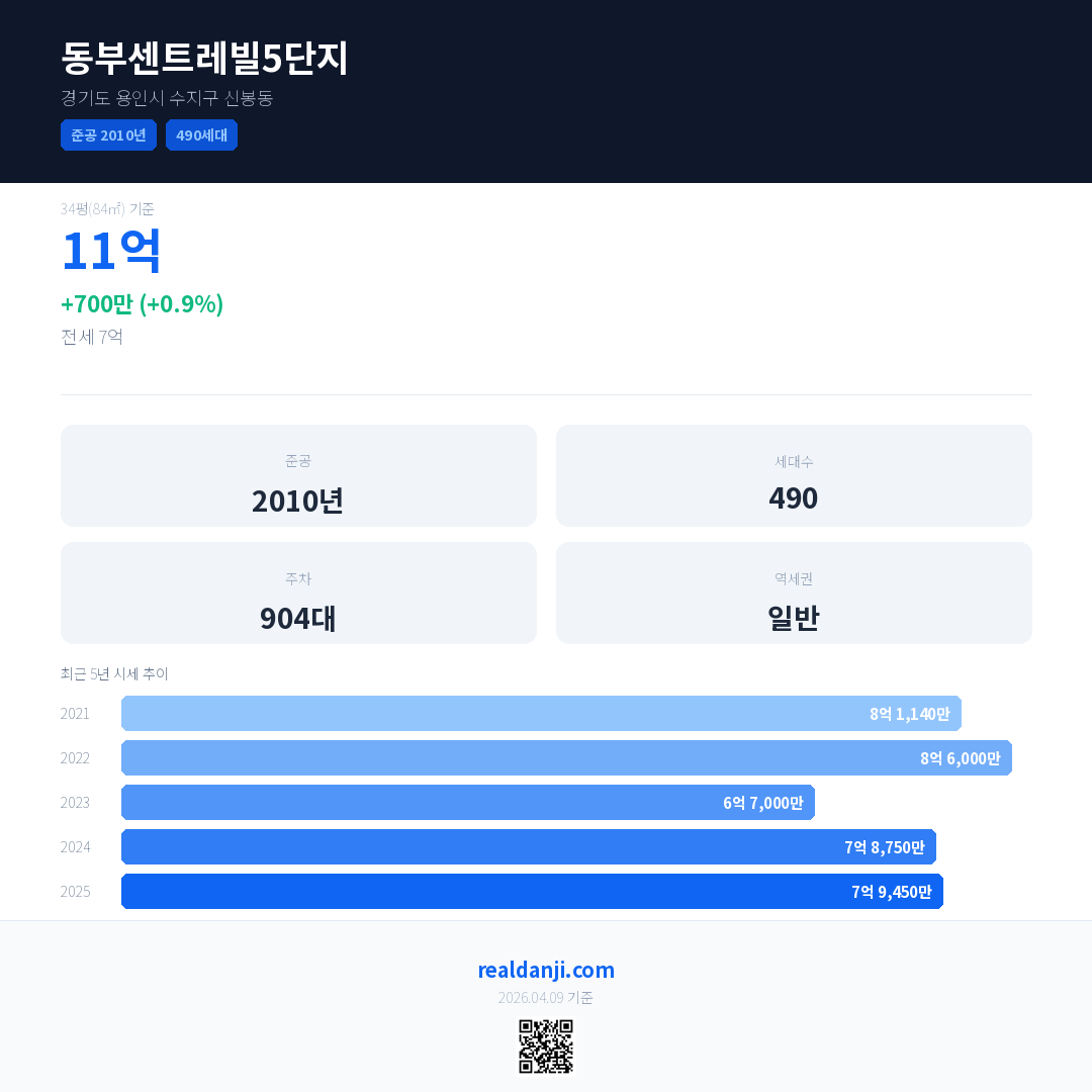 동부센트레빌5단지 최근 거래가는 11억입니다. (2026-03)