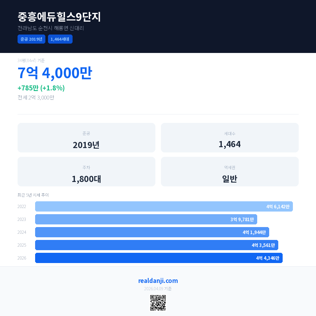 중흥에듀힐스9단지 국민평형 기준 2026년 평균 거래가는 4억 4,346만으로, 전년 대비 1.8% 상승 했습니다.