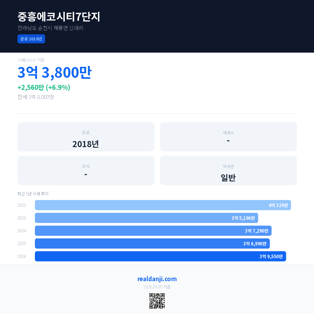 중흥에코시티7단지 국민평형 기준 2026년 평균 거래가는 3억 9,550만으로, 전년 대비 6.9% 상승 했습니다.
