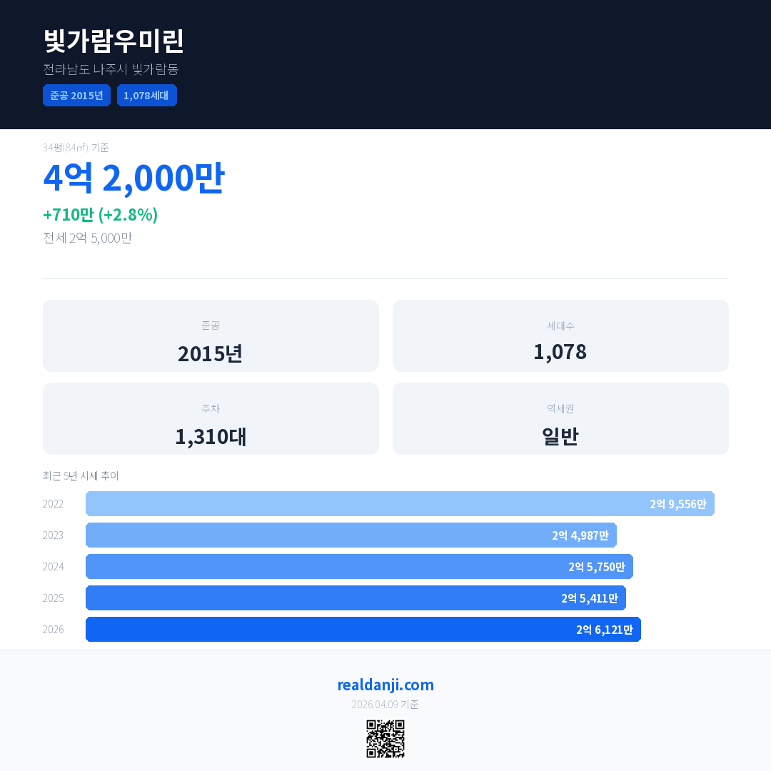 빛가람우미린 국민평형 기준 2026년 평균 거래가는 2억 6,121만으로, 전년 대비 2.8% 상승 했습니다.