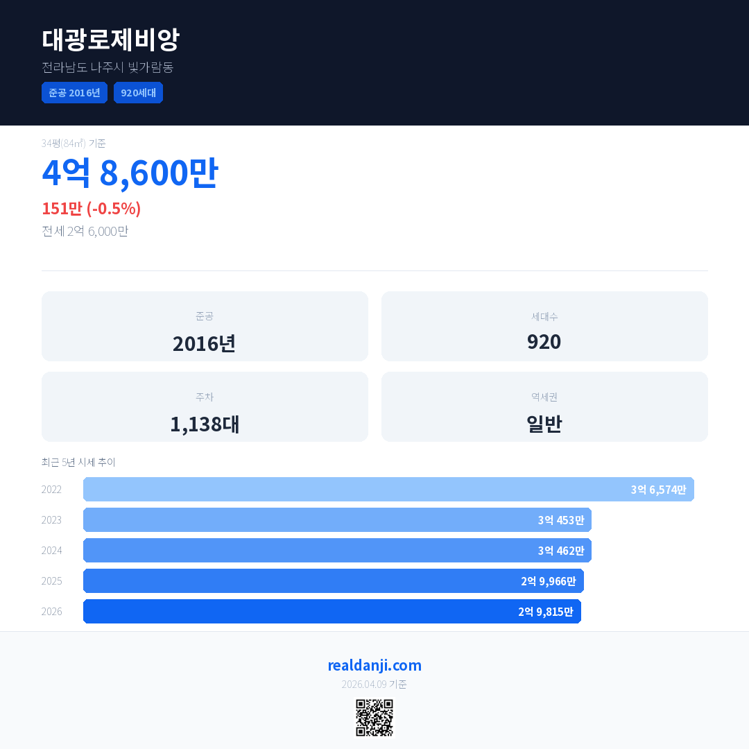 대광로제비앙은(는) 2016년에 준공되었으며, 현재 10년차입니다. 총 920세대 규모입니다.