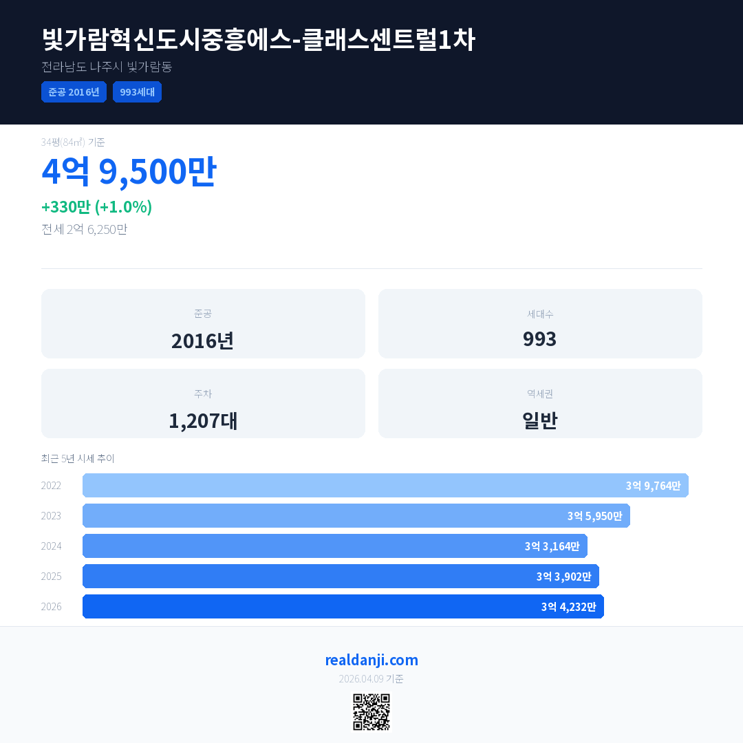빛가람혁신도시중흥에스-클래스센트럴1차 국민평형 기준 2026년 평균 거래가는 3억 4,232만으로, 전년 대비 1.0% 상승 했습니다.
