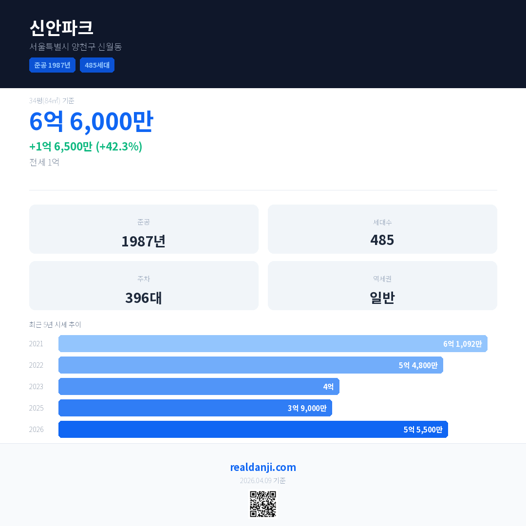 신안파크 국민평형 기준 2026년 평균 거래가는 5억 5,500만으로, 전년 대비 42.3% 상승 했습니다.
