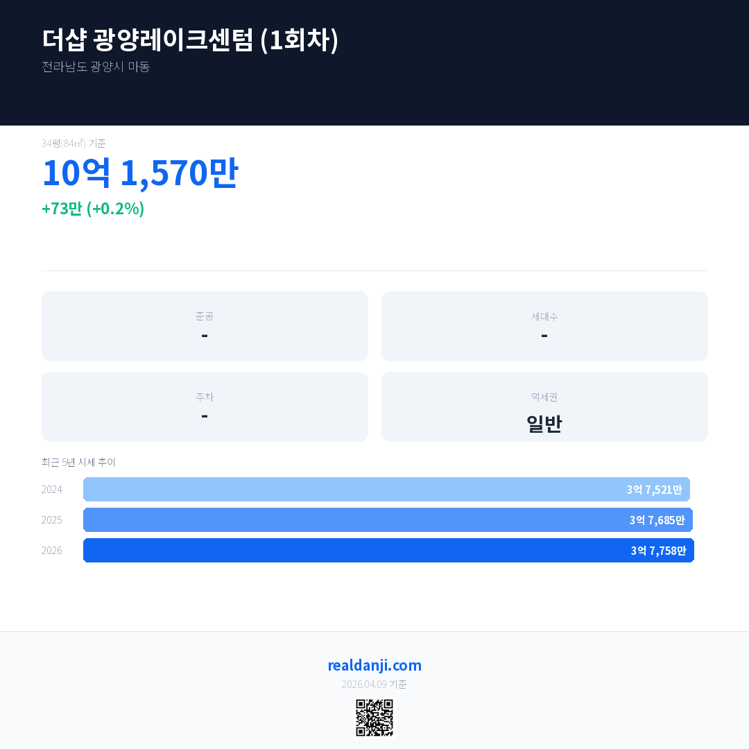 더샵 광양레이크센텀 (1회차) 최근 거래가는 3억 8,370만입니다. (2026-03)