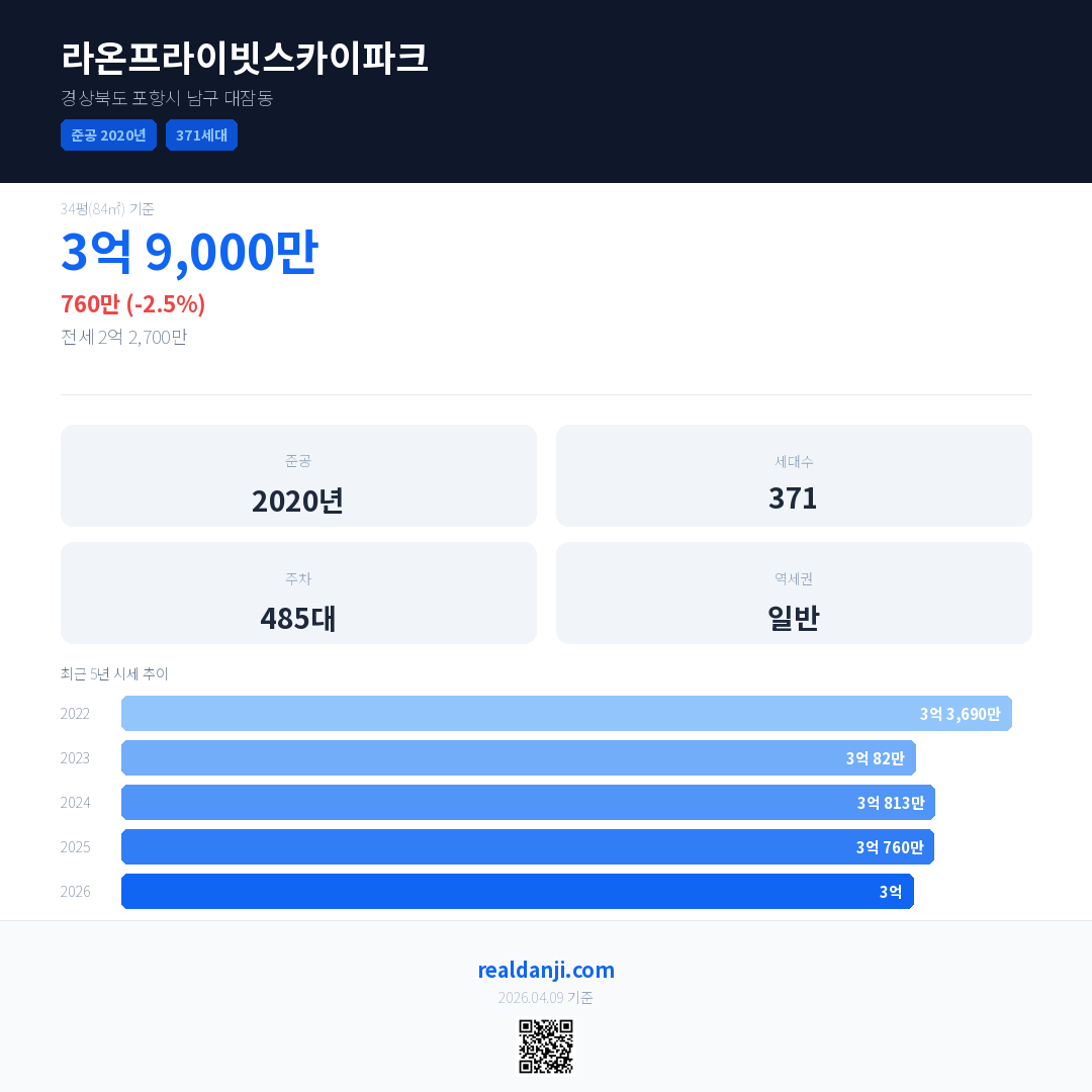 라온프라이빗스카이파크 국민평형 기준 2026년 평균 거래가는 3억으로, 전년 대비 2.5% 하락 했습니다.