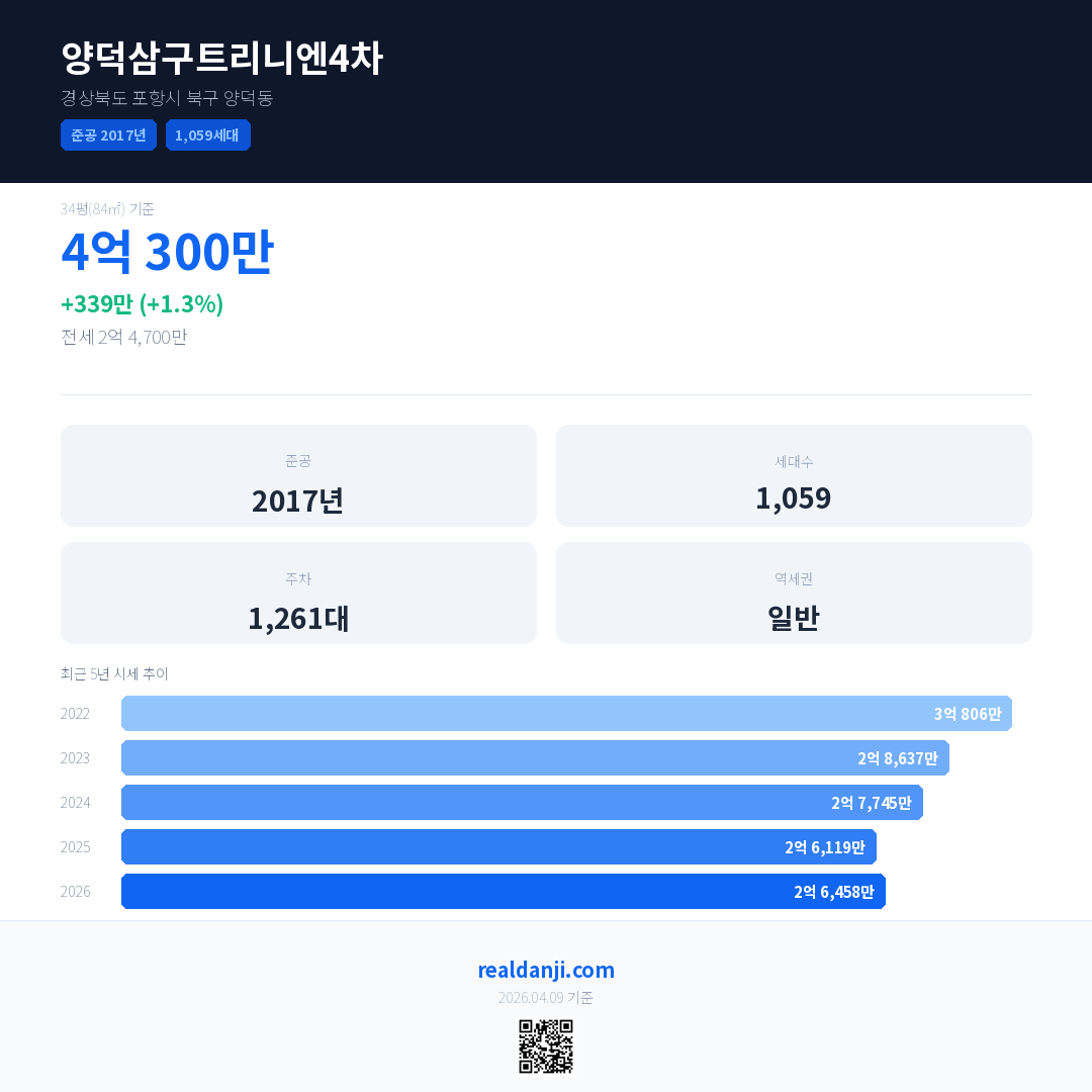 양덕삼구트리니엔4차 최근 거래가는 4억 300만입니다. (2026-03)