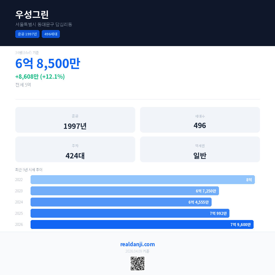 우성그린 국민평형 기준 2026년 평균 거래가는 7억 9,600만으로, 전년 대비 12.1% 상승 했습니다.