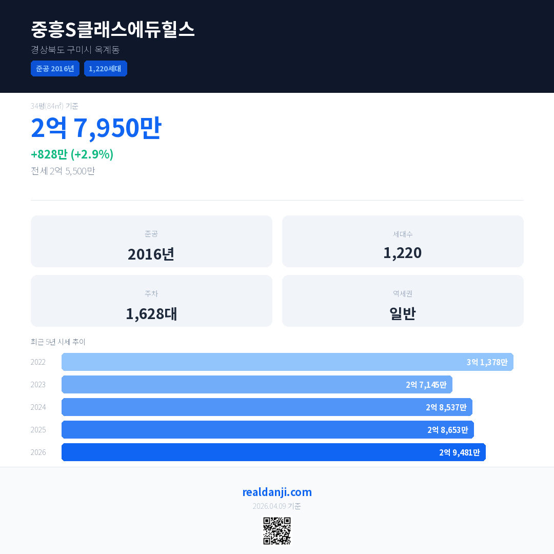 중흥S클래스에듀힐스은(는) 2016년에 준공되었으며, 현재 10년차입니다. 총 1,220세대 규모입니다.