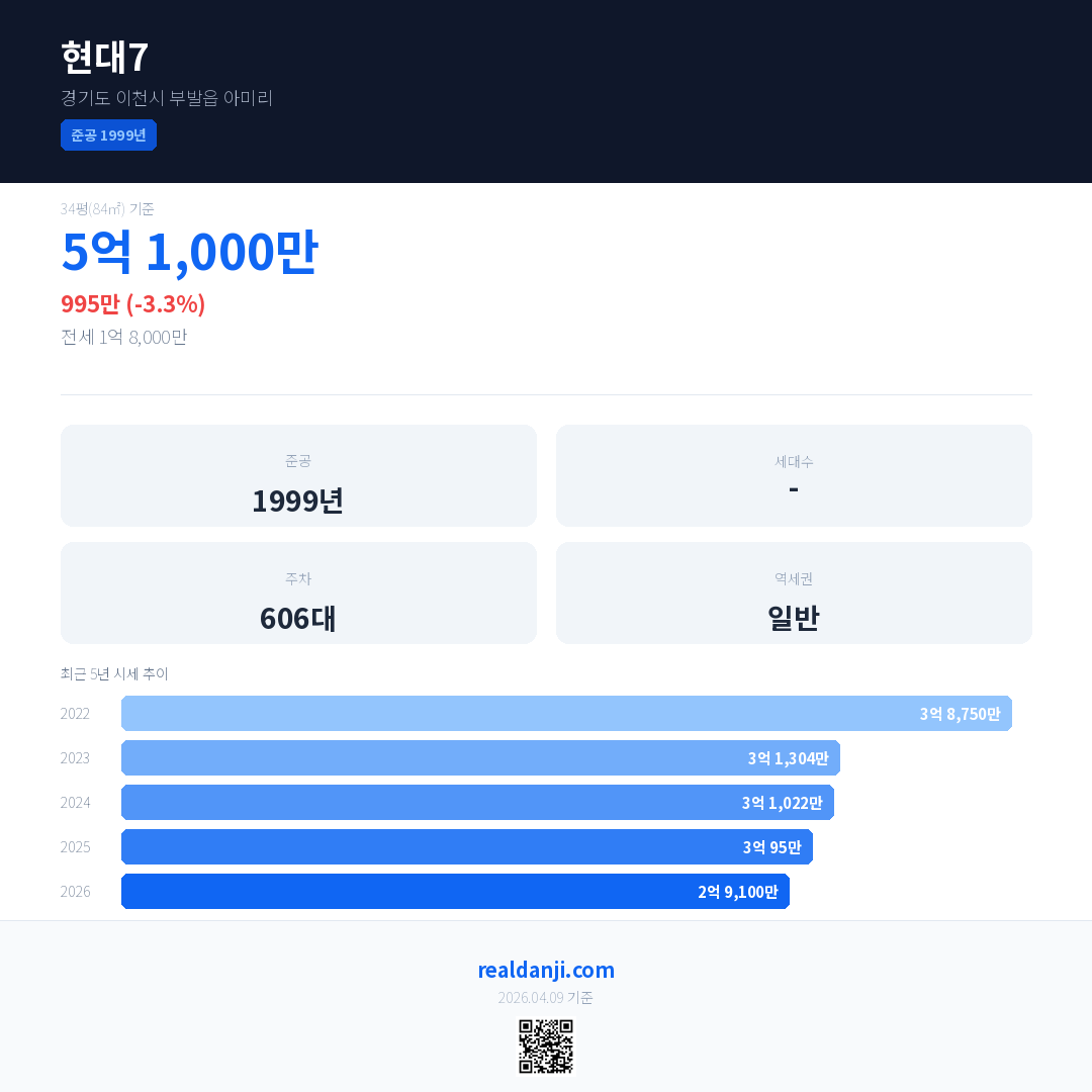 현대7 국민평형 기준 2026년 평균 거래가는 2억 9,100만으로, 전년 대비 3.3% 하락 했습니다.